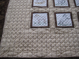 This next quilt belongs to Diane. She brought me the embroidered blocks and all the fabric and a picture of how she wanted the quilt constructed and asked me to piece it, quilt it, and bind it. I don't get requests like this very often, I spend so much time at my LA that actually putting together a quilt was a fun change of pace for me.